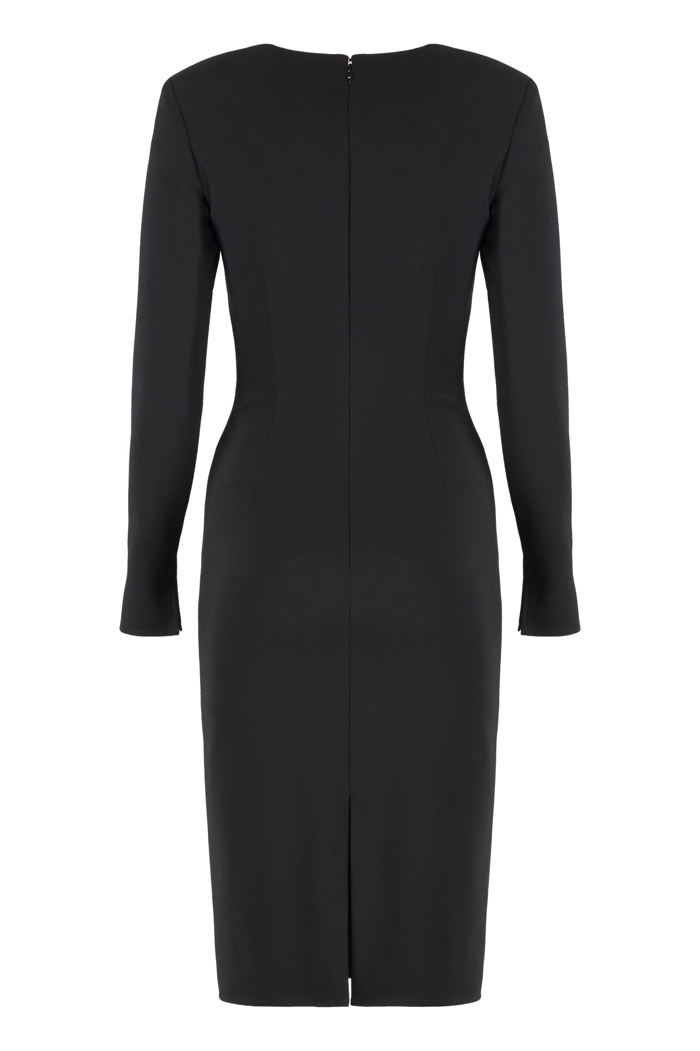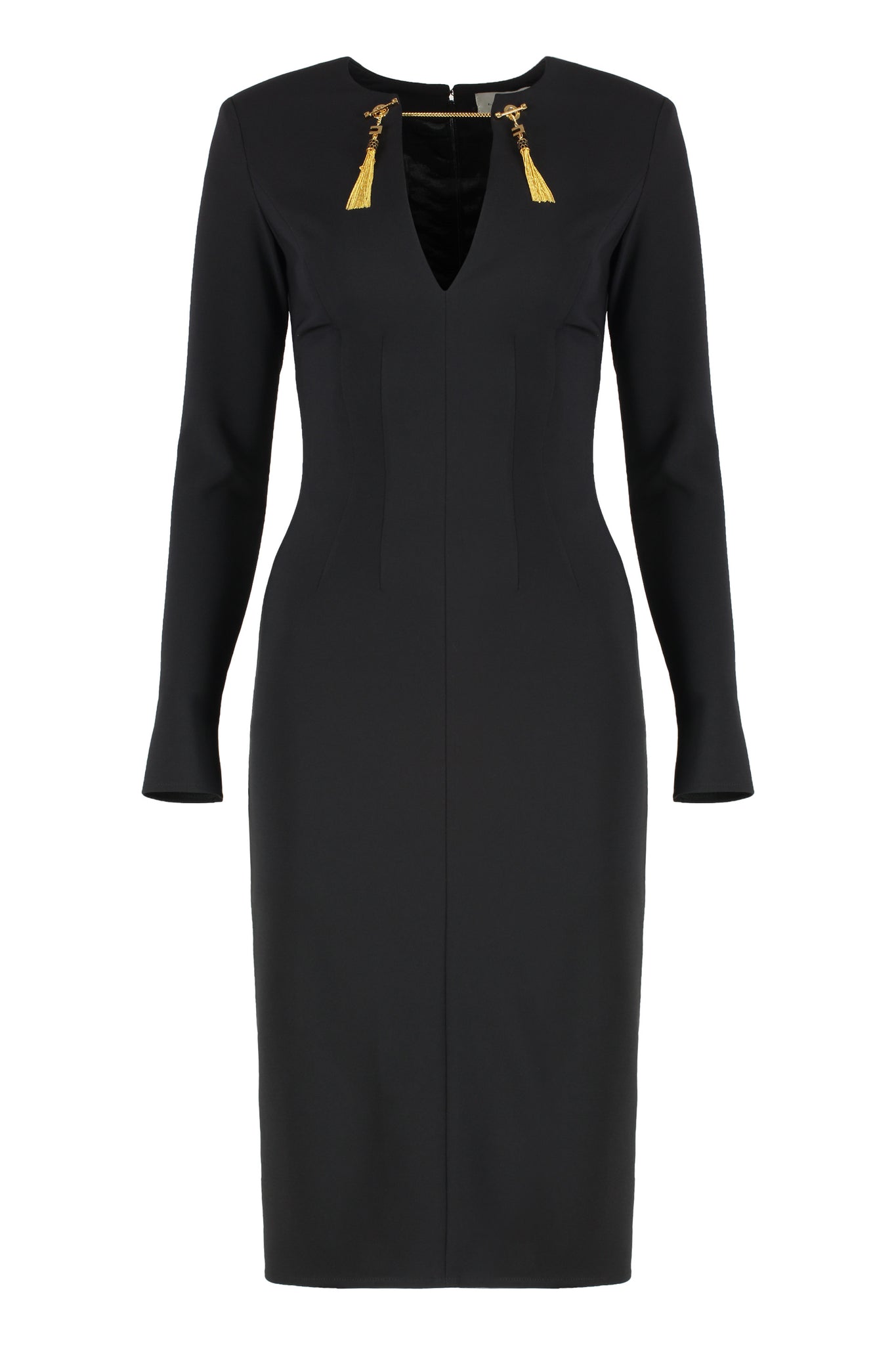 Abito in crêpe leggero dalla vestibilità slim. Il vestito ha spalle strutturate e girocollo con scollo a V impreziosito dai gemelli in catena con nappine in trama snake, amovibili per sperimentare più opzioni di styling. La cintura con logo sottolinea il punto vita. Spacco sul retro per una silhouette audace. Realizzato in un tessuto di alta qualità, l'abito adatta la silhouette in modo raffinato, rendendolo ideale per occasioni formali o eventi serali.
